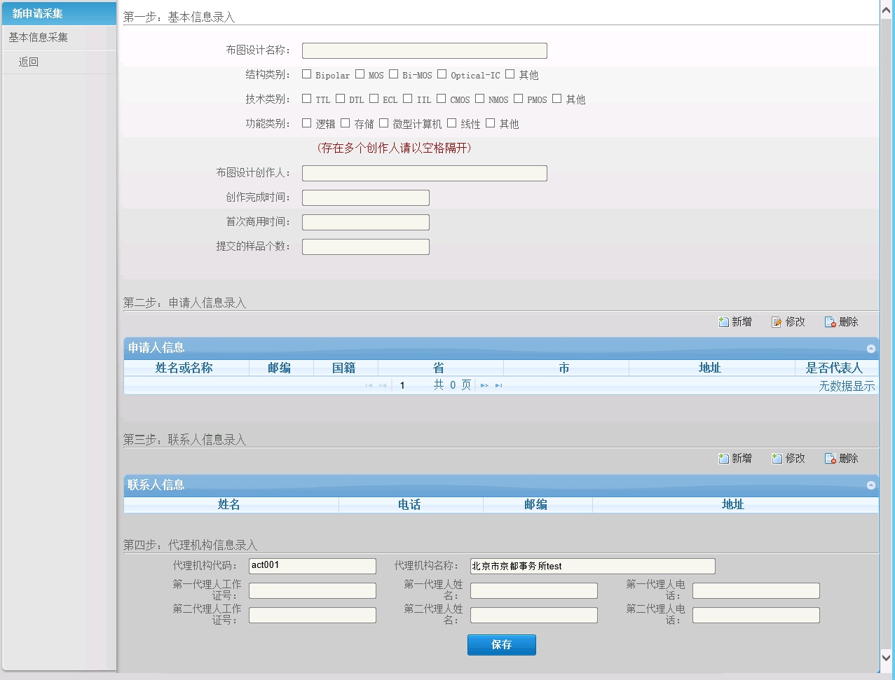 b)可对申请人、联系人、代理机构进行"新增、删除、修改"操作。