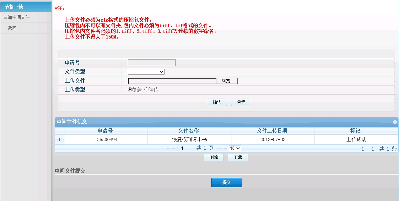 登录系统后,点击"其它文件提交",点击"普通中间文件"打开中间文件上传页面。