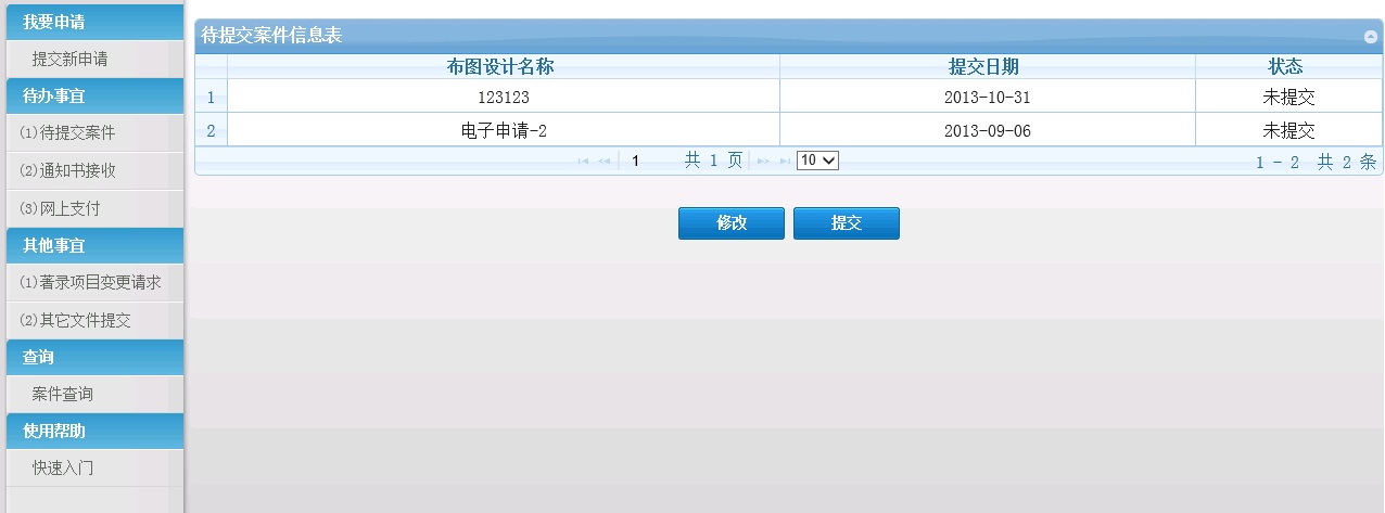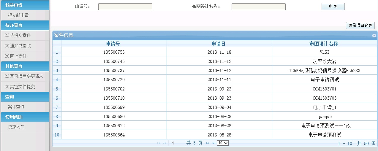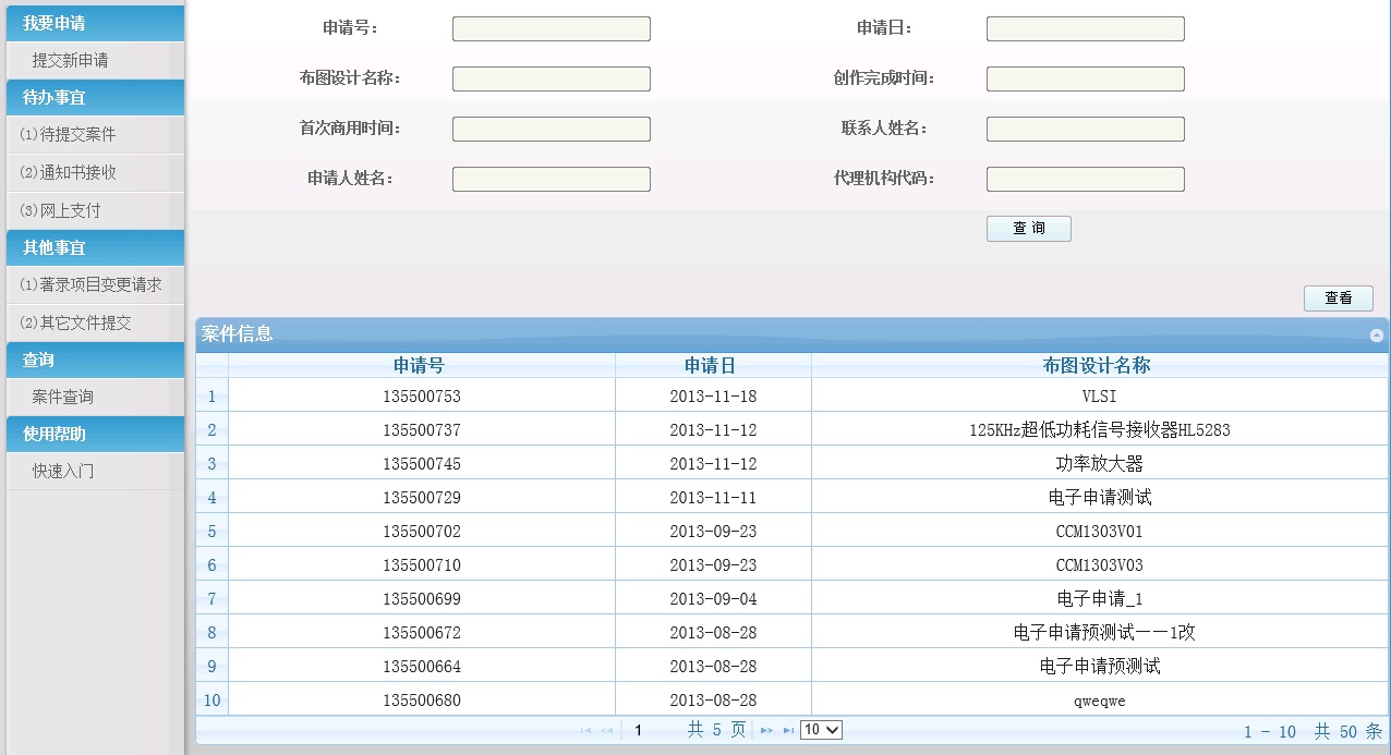 1.登录系统后,点击"案件查询",打开案件查询页面。 a)通过相关条件,查询已提交的集成电路布图设计。