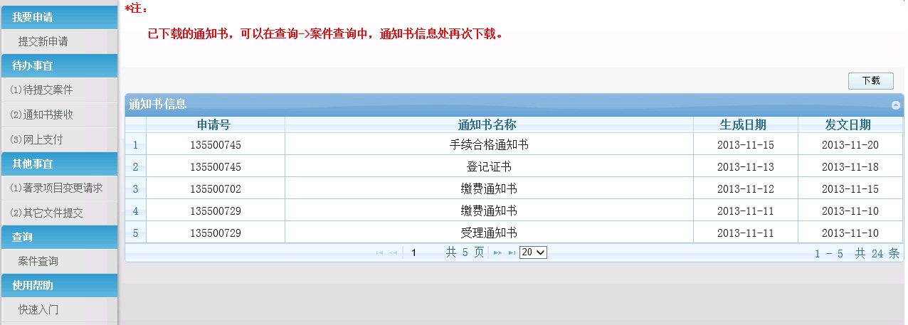 b)提供通知书下载功能 待提交案件