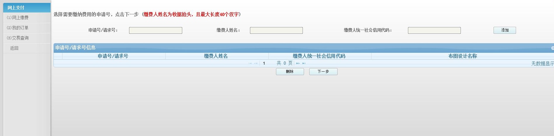 2.输入缴费的申请号或请求号、缴费人姓名后,点击"添加",可同时对多个申请号或请求号进行缴费。