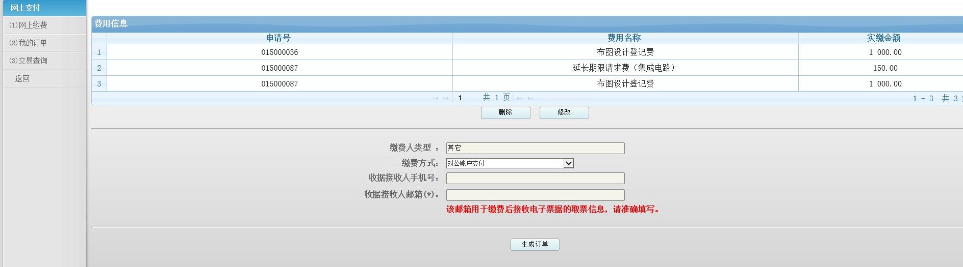 c)相关信息填写完毕后,点击"生成订单"