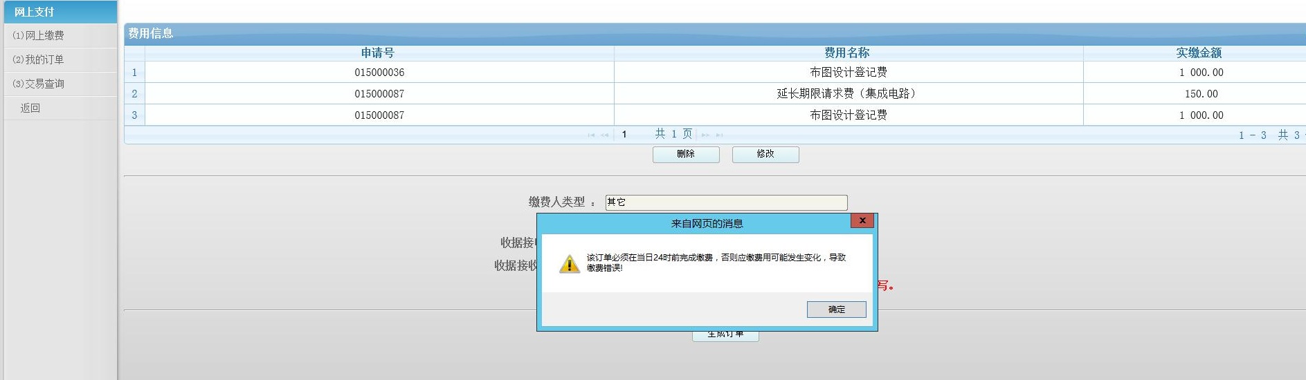 订单必须在当日24时前完成缴费,否则应缴费用可能发生变化,导致缴费错误!
