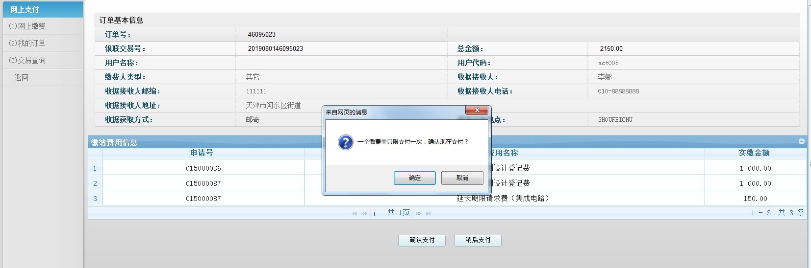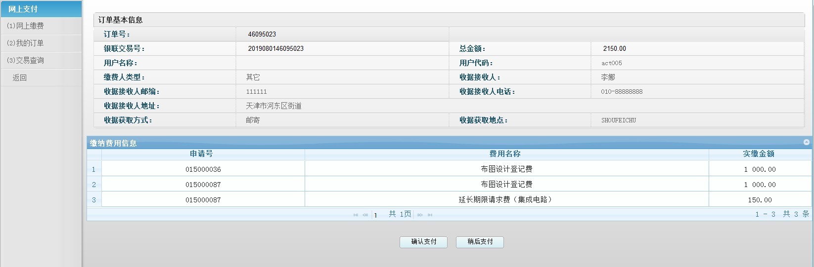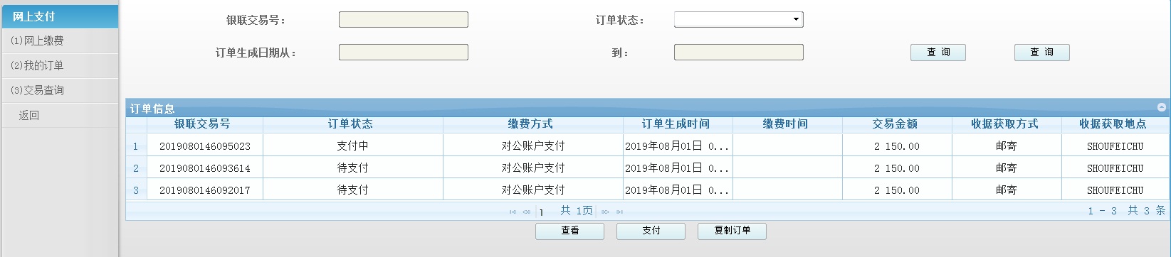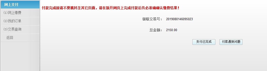c)点击"确认支付"并在打开的银联交易页面支付完成后,需返回系统确认缴费结果。对于付款遇到问题的订单,可在"我的订单"页面中,使用"复制订单"功能,重新进行支付。